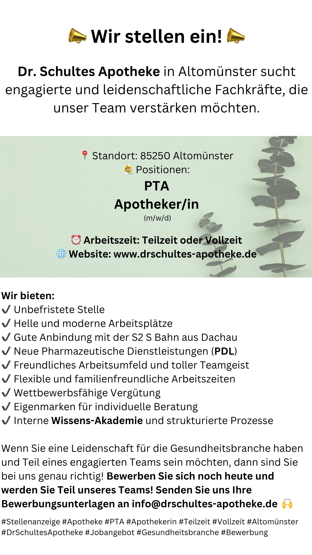 Verändern Sie sich und wechseln Sie jetzt aus Ihrem gewohnten Arbeitsumfeld in unsere Apotheke. Werden Sie Teil unseres tollen Teams und freuen Sie sich auf sympathische Kunden, tolle interdisziplinäre Vernetzung und spannende Beratungsprojekte.